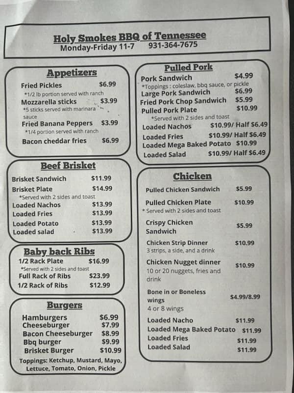 Welcome to Holy Smokes BBQ of TN, where the heart of southern cooking comes alive! Nestled in Chapel Hill, our restaurant serves up a mouthwatering array of BBQ and comfort food, infused with family recipes passed down through generations. From smoky brisket to savory pulled pork, each dish is crafted with care and authenticity. Enjoy our inviting outdoor seating or opt for fast takeout and delivery. Whether you're stopping by for lunch, dinner, or a solo meal, you're sure to leave satisfied. Join us to experience the sweetest and most sultry tastes that define true southern cuisine!